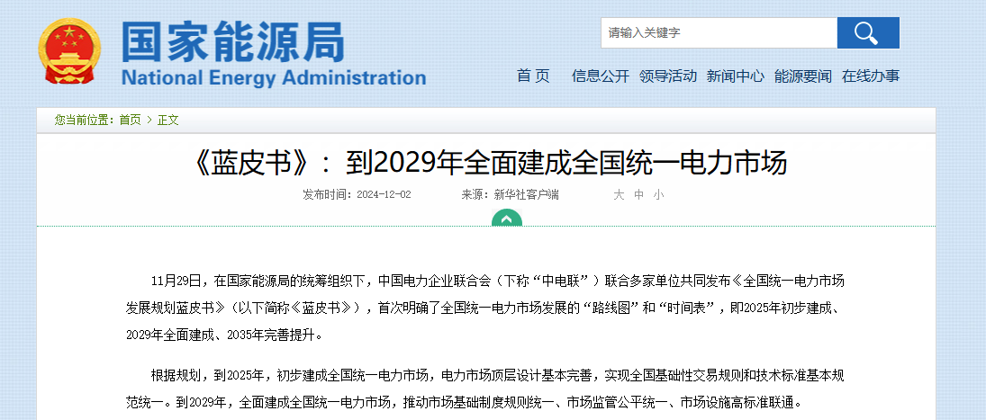 11月29日,在国家能源局的统筹组织下,中国电力企业联合会(下称“中电联”)联合多家单位共同发布《全国统一电力市场发展规划蓝皮书》(以下简称《蓝皮书》),首次明确了全国统一电力市场发展的“路线图”和“时间表”,即2025年初步建成、2029年全面建成、2035年完善提升。